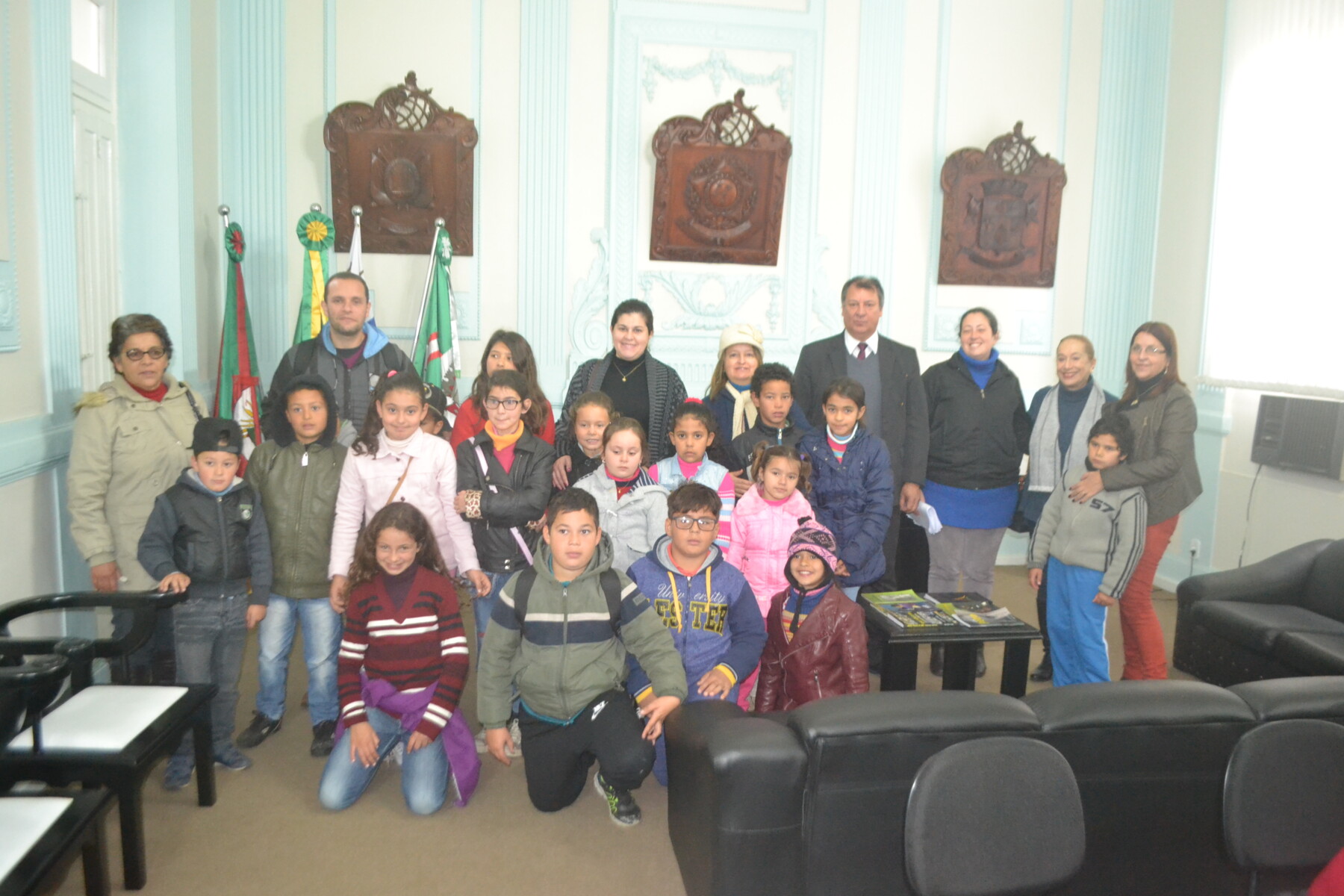 Na manhã desta quarta feira (14) o prefeito Ico Charopen recebeu em seu gabinete a visita de estudantes do Pré ao 5ºano, e professores da Escola municipal Aldrovando Santana, que vieram conhecer o Prefeito e as instalações do Palácio Moysés Vianna. Estavam presentes também a secretária de educação Maria Regina do Prado Alves, a diretora da escola Vanessa Castro, e a vice diretora Vera Costa.