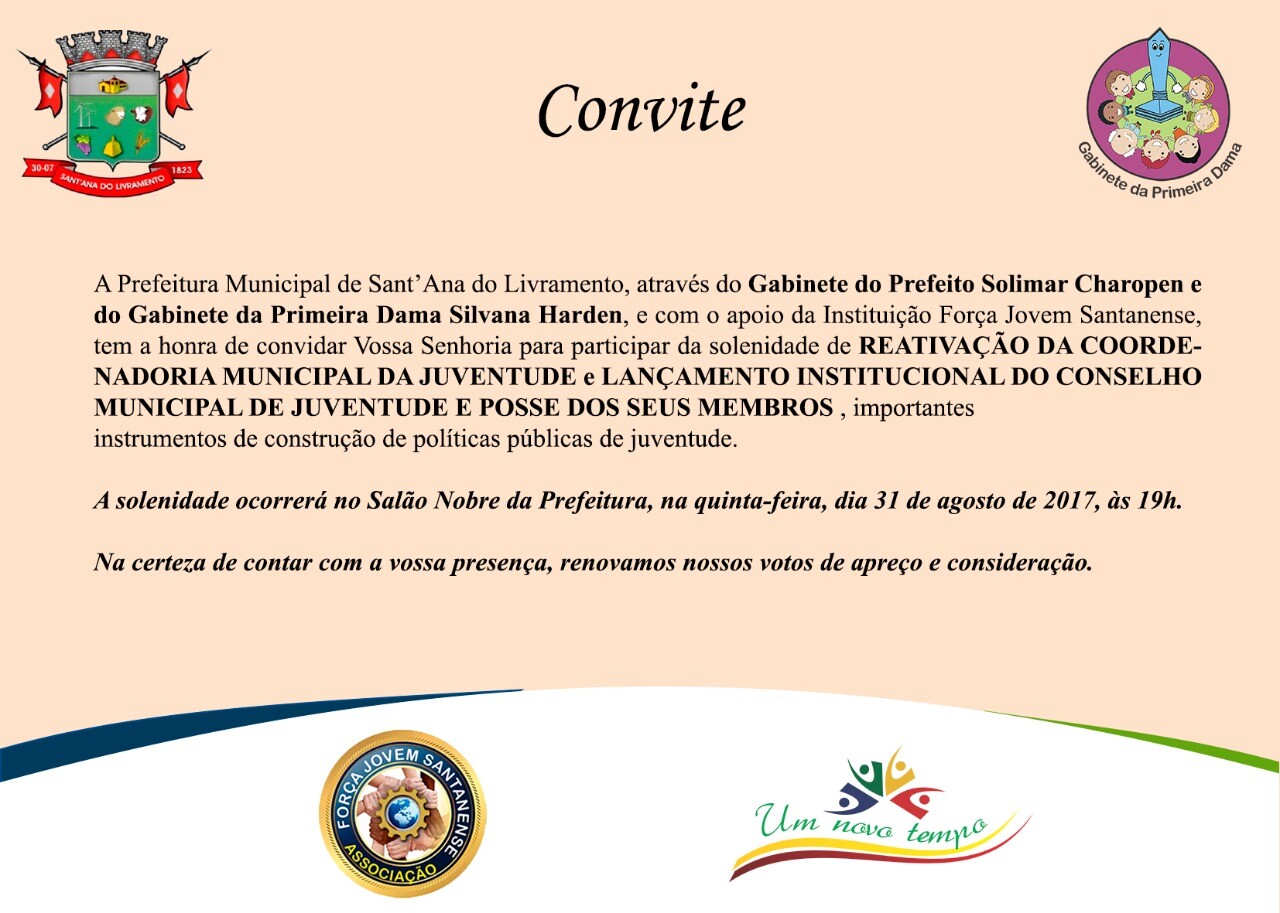 Acontece nesta quinta-feira (31), às 19h, no Salão Nobre da Prefeitura, a solenidade de Reativação da Coordenadoria Municipal da Juventude e Lançamento Institucional do Conselho Municipal da Juventude e posse de seus membros. O evento é uma promoção do Gabinete do Prefeito Solimar Charopen e do Gabinete da Primeira Dama Silvana Harden, com o apoio da Instituição da Força Jovem Santanense.