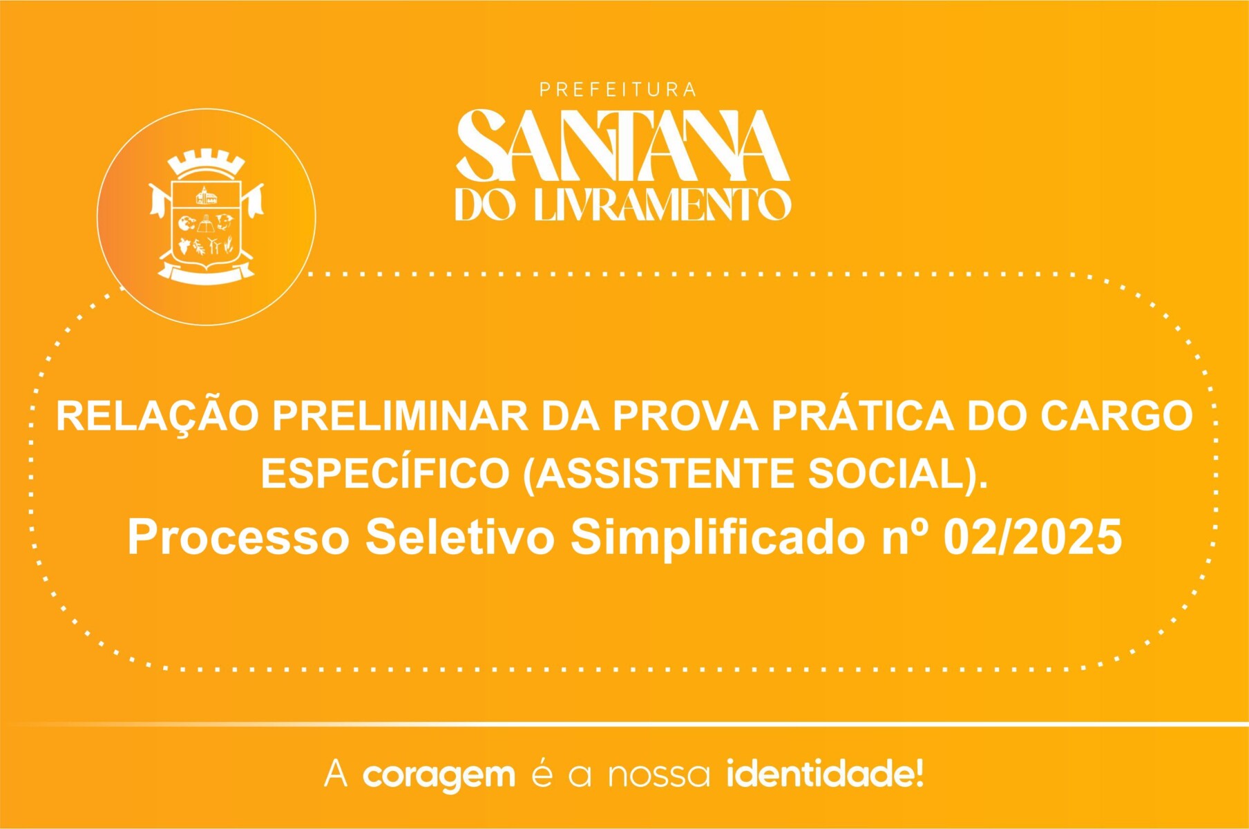 A Secretaria Municipal de Assistência e Inclusão Social de Sant’Ana do Livramento – SMAIS, situada na Rua 7 de Setembro, 515, Sant’Ana do Livramento, através da Comissão Designada pela Portaria nº 794 de 10 de abril de 2025. DIVULGA A RELAÇÃO PRELIMINAR DA PROVA PRÁTICA PARA O CARGO ESPECIFICO - (ASSISTENTE SOCIAL) do Processo Seletivo 02/2025. (Em anexo)