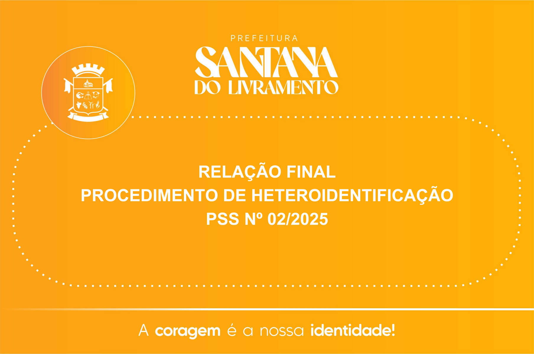 A Secretaria Municipal de Assistência e Inclusão Social de Sant’Ana do Livramento – SMAIS, situada na Rua 7 de Setembro, 515, Sant’Ana do Livramento, através da Comissão Designada pela Portaria nº 794 de 10 de abril de 2025. DIVULGA A RELAÇÃO FINAL DO PROCEDIMENTO DE HETEROIDENTIFICAÇAO REFERENTE AO PROCESSO SELETIVO SIMPLIFICADO N° 02/2025.