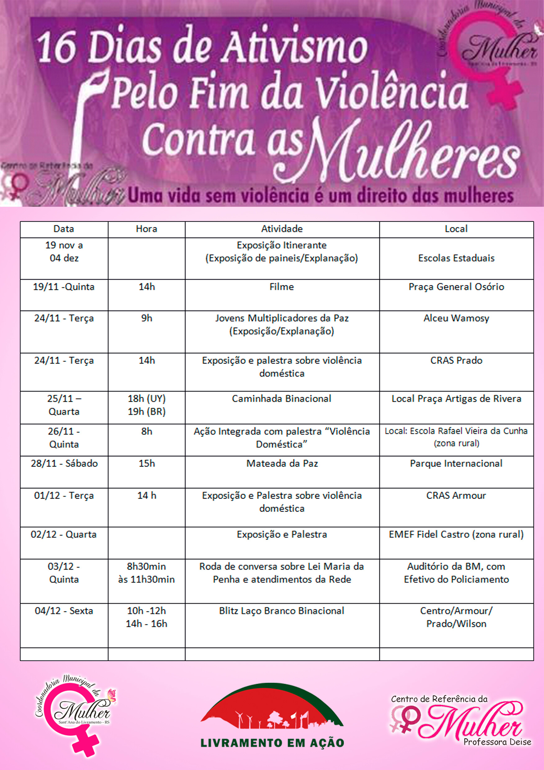Terá início, nesta quinta-feira (19), as atividades alusivas aos “16 dias de ativismo”, que são promovidas pela Coordenadoria Municipal da Mulher e Centro de Referência da Mulher, e se estenderão até o dia 04 de dezembro.