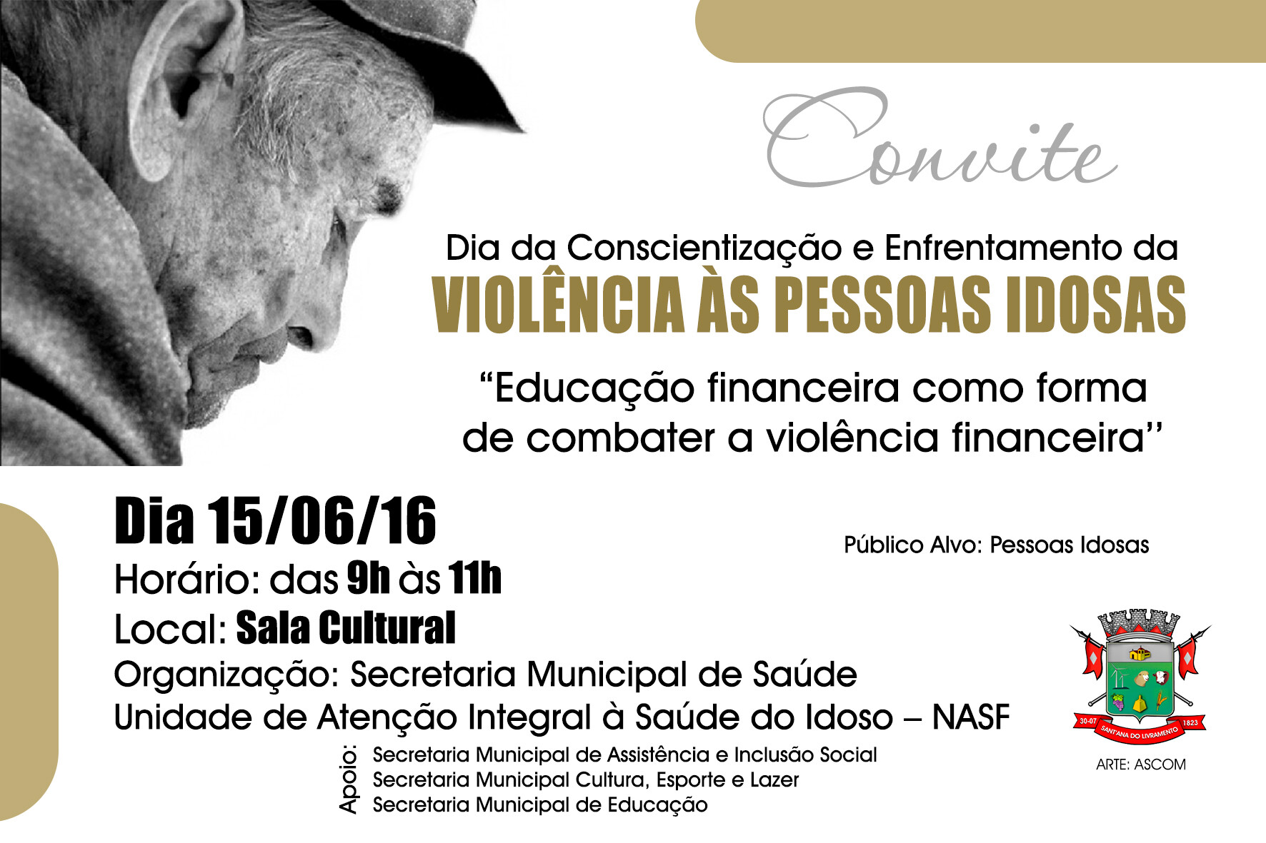 A Prefeitura Municipal, através da Secretaria de Saúde, promoverá, nesta quarta-feira, dia 15, uma atividade alusiva ao Dia da Conscientização e Enfrentamento da Violência às Pessoas Idosas.