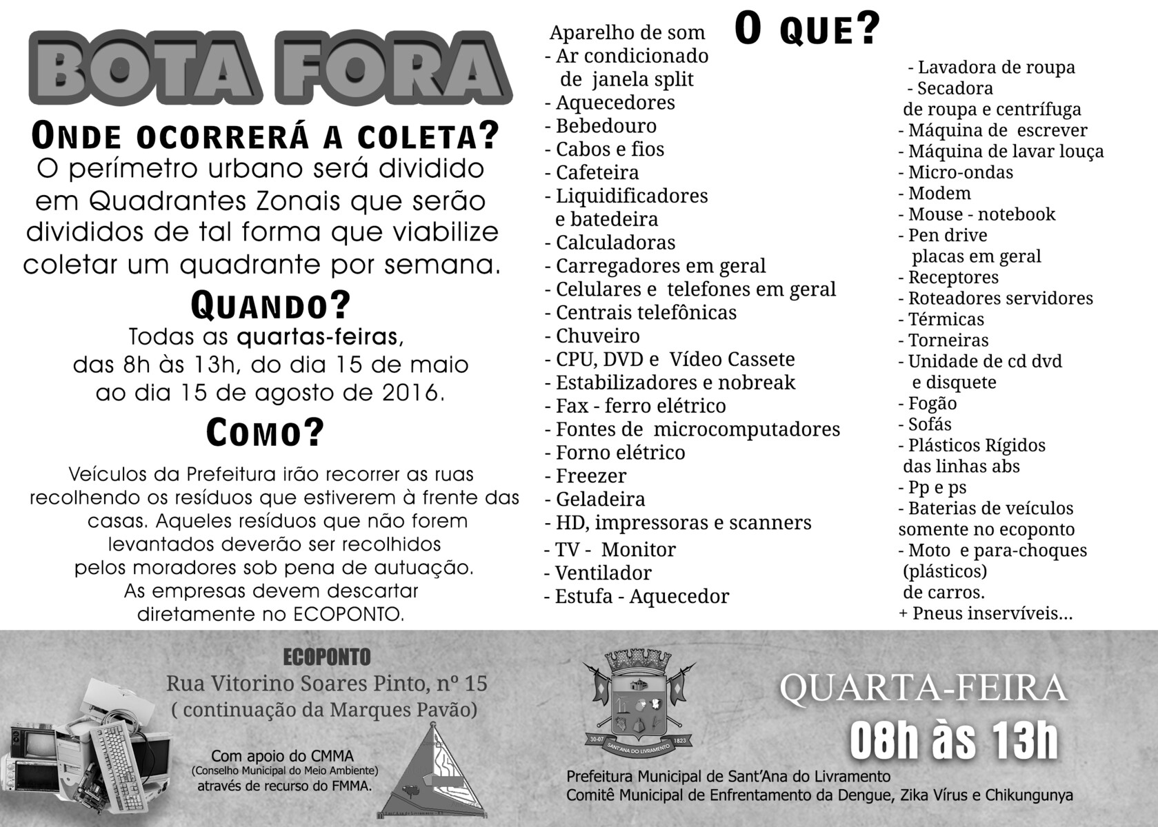 A Prefeitura Municipal, junto ao Comitê Municipal de Enfrentamento da Dengue, Zika Vírus e Chikungunya e com o apoio do Conselho Municipal do Meio Ambiente realizam, nesta quarta-feira (15), mais uma ação da Campanha “Bota Fora”, que tem como objetivo eliminar os focos do mosquito Aedes Aegypti dando destino adequado aos resíduos não domésticos denominados lixo branco, eletrônicos, pneus inservíveis e artefatos de madeira.