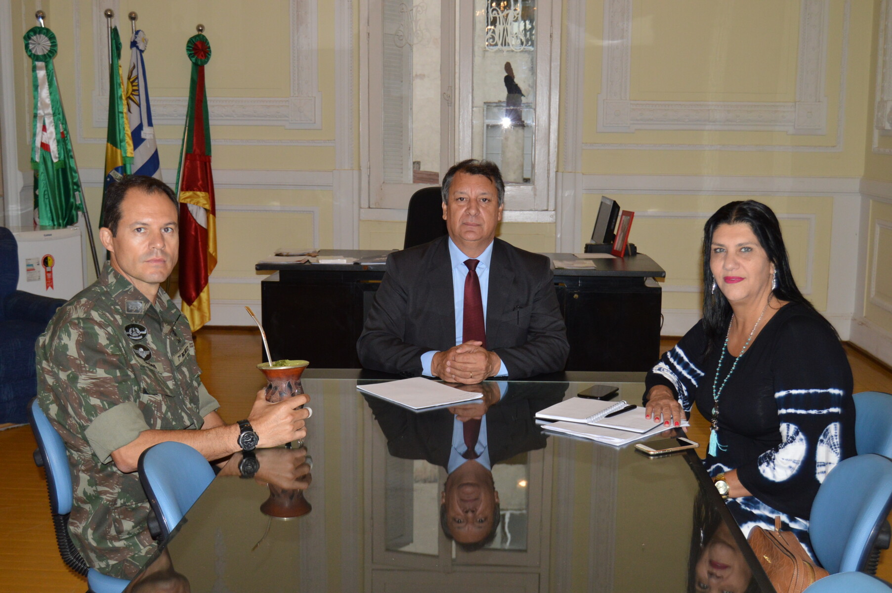 Na manhã desta quarta-feira (08) o prefeito Ico Charopen e a vice-prefeita Mari Machado receberam o comandante do 7º Regimento de Cavalaria Mecanizado e da Guarnição Federal de Sant’Ana do Livramento, tenente coronel Carlos Alexandre de Souza, que estava acompanhado do responsável das Relações Públicas do quartel, Sandro Lopes.