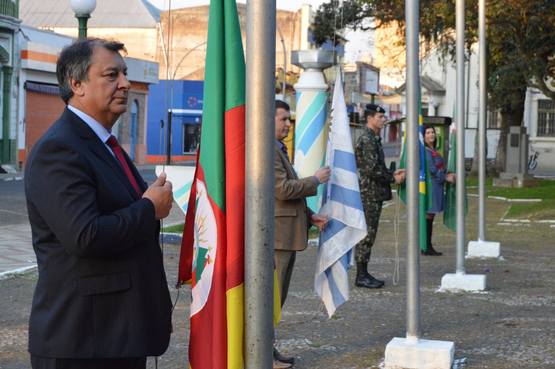 O ato de hasteamento dos pavilhões na Praça General Osório, abriu as comemorações deste domingo (30), dia em que Sant’Ana do Livramento comemora 194 anos. O ato contou com a presença do Prefeito Ico Charopen; da Vice-Prefeita Mari Machado; do Comandante do 7º RCMec, Coronel Carlos Alexandre de Souza; do Presidente da Junta Parlamentar de Rivera, José Luis Pereira. A cerimônia foi acompanhada pelo secretariado municipal e por servidores.