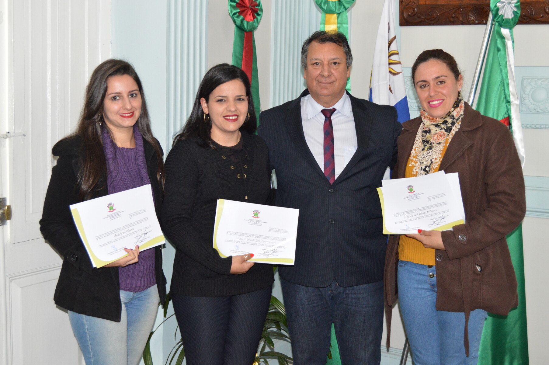 Três novas escriturárias foram empossadas na manhã desta segunda-feira (07), na Prefeitura Municipal de Sant’Ana do Livramento. As novas servidoras receberam as boas vindas do Secretário de Administração, Fernando Linhares e do Prefeito Ico Charopen, que destacou a preocupação da administração municipal com os servidores, falando ainda, sobre a prorrogação do prazo do Concurso. As novas escriturárias aturarão junto a Secretaria Municipal da Fazenda.