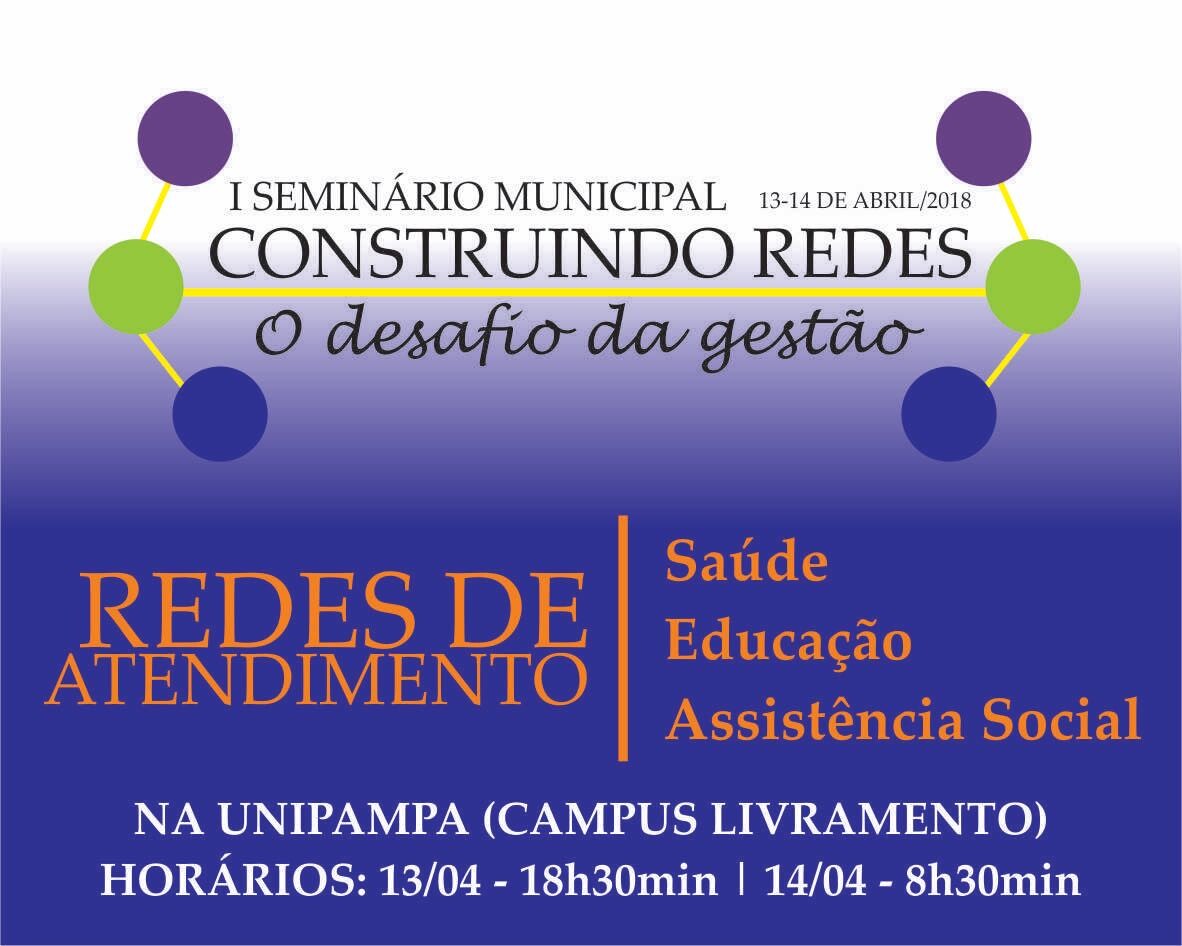 Nos próximos dias 13 e 14 de abril, a Prefeitura Municipal de Livramento promove o I Seminário Municipal Construindo Redes “O desafio da gestão”. O encontro irá reunir servidores das redes de atendimento da Saúde, da Educação e da Assistência Social, em um amplo debate que propõe um protocolo padrão e integrado de atendimento.