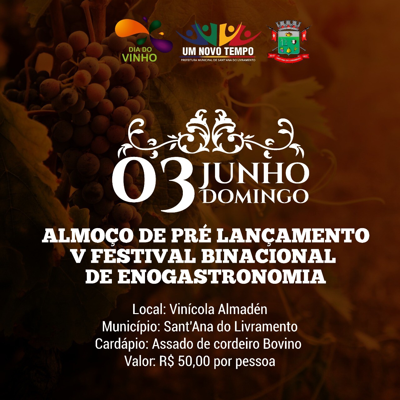Para comemorar o Dia Municipal do Vinho, a Secretária de Turismo promove um belo almoço neste domingo (3), na Vinícola Almaden. Com um belo assado de cordeiro também será realizado o pré-lançamento do V Festival Binacional de Enogastronomia.