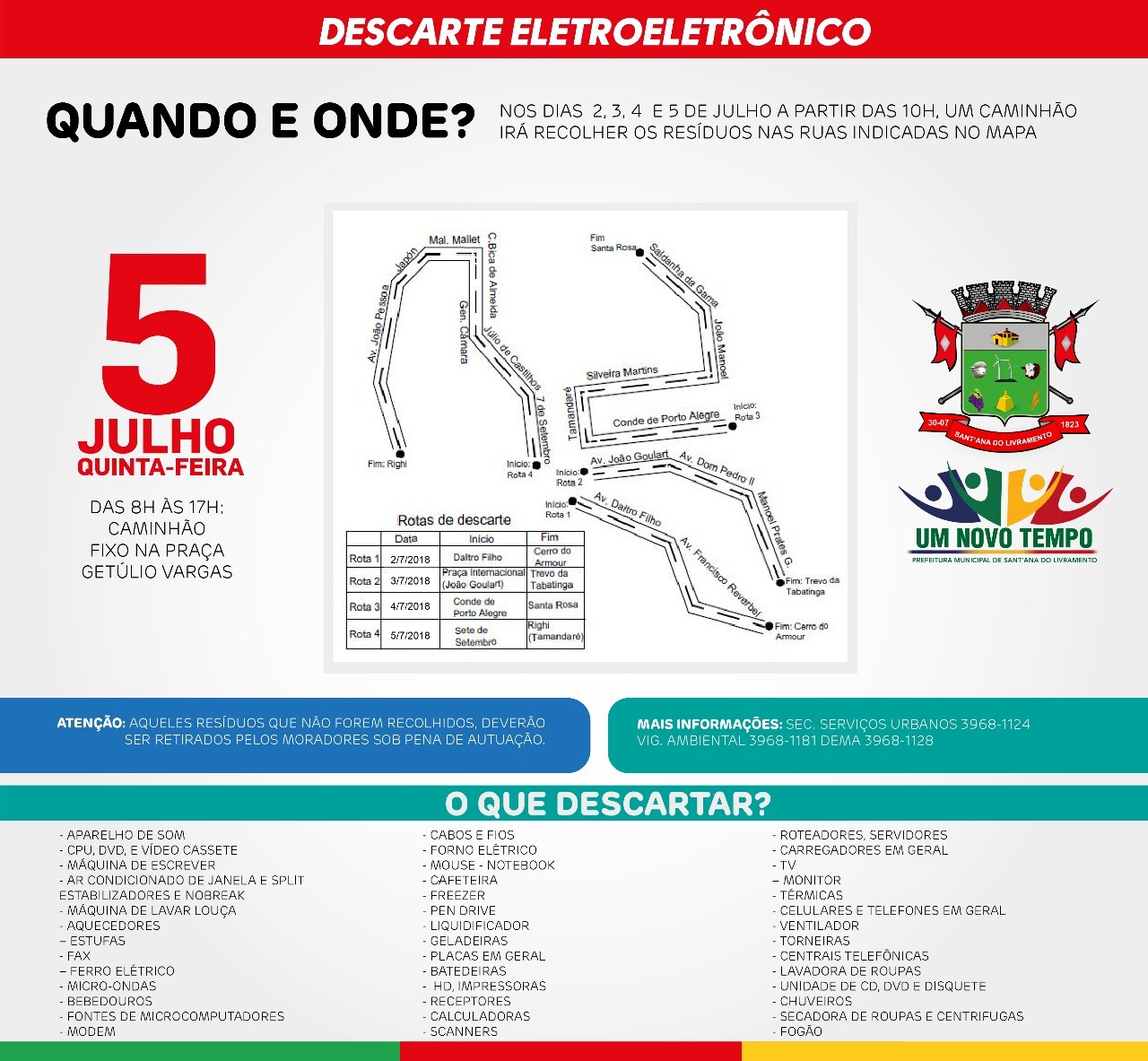 Inicia na semana que vem mais uma edição da Campanha de Descarte Consciente de Resíduos EletroEletrônicos, promovida pela Prefeitura Municipal. Com o objetivo de dar o destino correto a eletroeletrônicos em desuso e promover a sustentabilidade, a campanha acontecerá de forma itinerante pelo município, com o recolhimento de resíduos em alguns pontos. A ação inicia na próxima segunda-feira (2) e segue até quinta-feira (5), com o recebimento de resíduos na Praça Getulio Vargas.