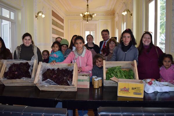 Na manhã de hoje (5), estudantes e professores da Escola Municipal Aldrovando Santana, promoveram uma pequena feira no Salão Nobre da Prefeitura. Na oportunidade, foram comercializados legumes e doces produzidos pela comunidade escolar e tendo como objetivo, a arrecadação de renda para o grupo de danças “Flor do Alecrim”. Composto por 25 alunas, o grupo está se preparando para apresentações na Semana Farroupilha, e arrecadando fundos para o pagamento da indumentária confeccionada para as apresentações.