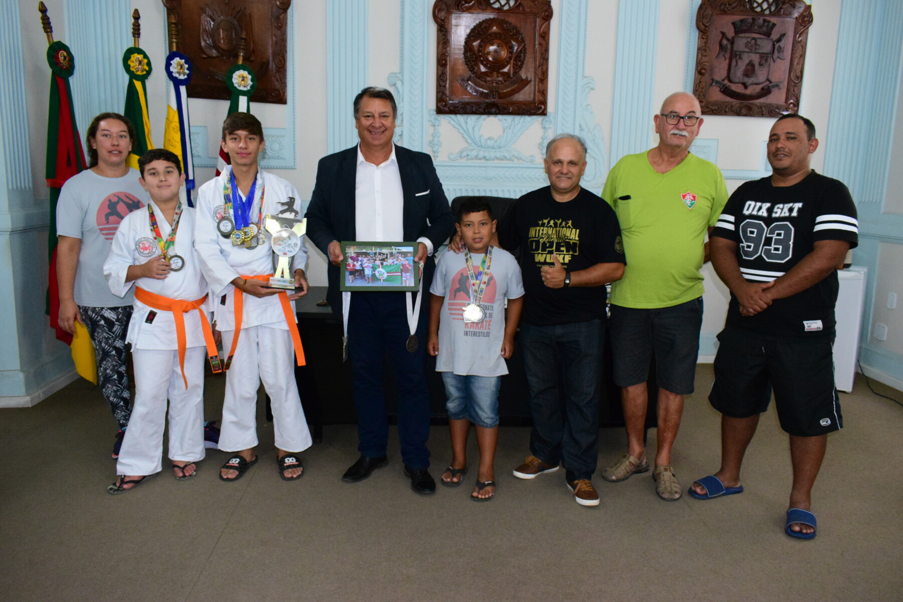 Nesta sexta-feira (8), o prefeito Ico Charopen recebeu um grupo de atletas da Academia Dojô Força e Honra. O grupo agradeceu o apoio logístico da Prefeitura que possibilitou a participação no Campeonato Estadual de Karatê Interestilos, realizado no fim do ano passado, na cidade de Santa Rosa. Na oportunidade, o grupo conquistou o troféu de 3º colocado, além de premiações individuais, entre os 15 atletas que participaram da competição.