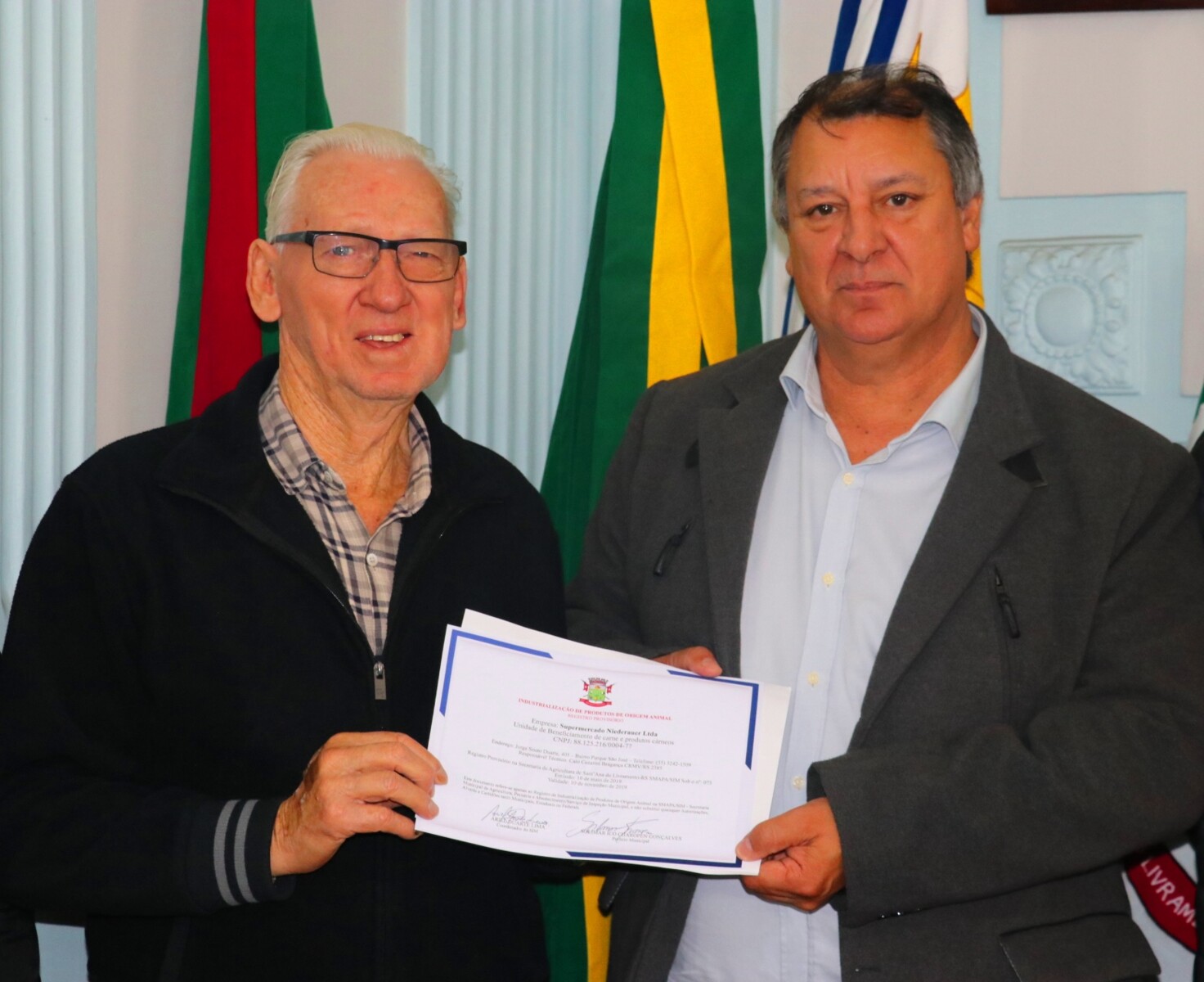 A entrega do registro foi realizada pelo prefeito Ico Charopen e pelo coordenador do Serviço de Inspeção Municipal (SIM), Ariel Duarte, ao proprietário do Supermercado, Arno Niederauer, que agradeceu o apoio do Executivo na expansão do empreendimento.