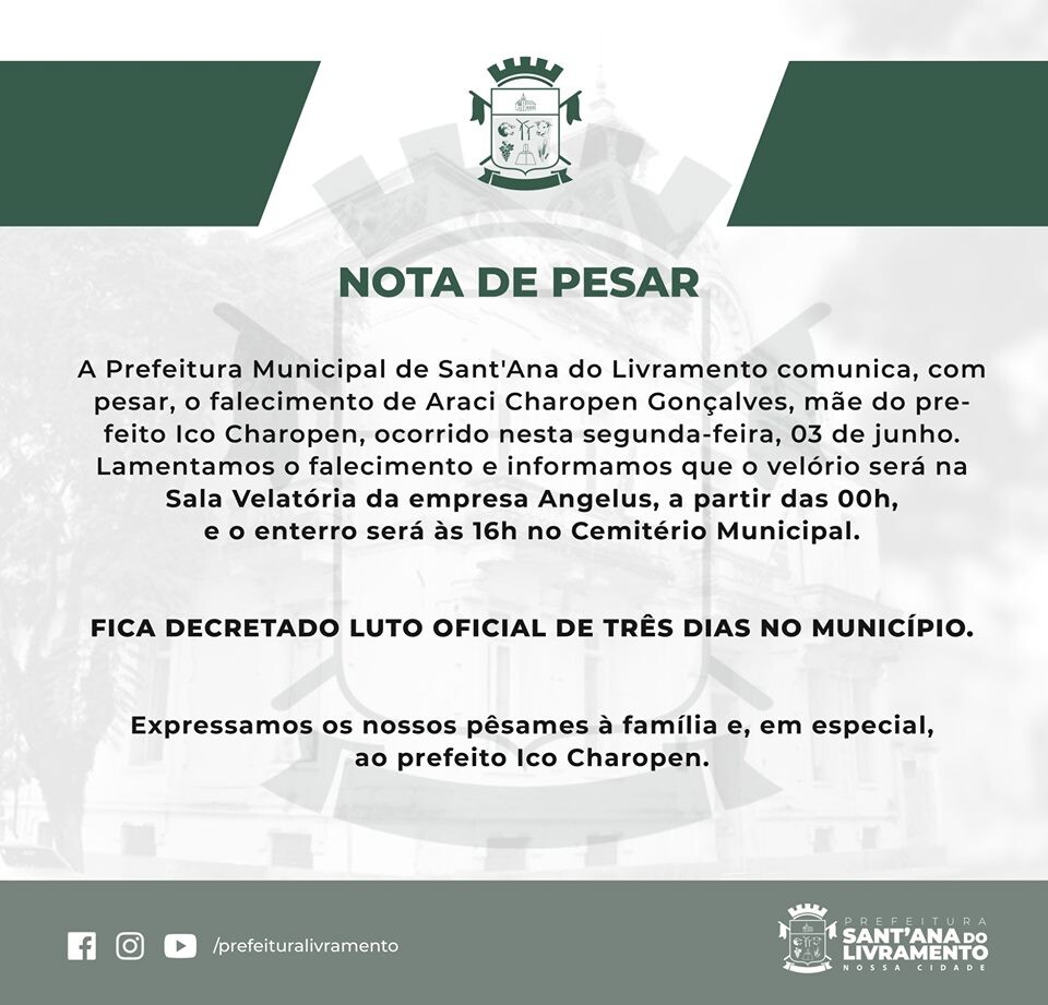 A Prefeitura Municipal de Sant'Ana do Livramento comunica, com pesar, o falecimento de Araci Charopen Gonçalves, mãe do prefeito Ico Charopen, ocorrido nesta segunda-feira, 03 de junho. Lamentamos o falecimento e informamos que o velório será na Sala Velatória da empresa Angelus, a partir das 00h, e o enterro será às 16h no Cemitério Municipal.
