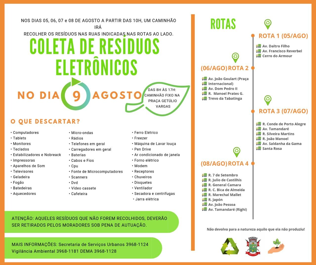 A Coleta de Resíduos Eletroeletrônicos já tem nova data e acontece na próxima semana, entre os dias 05 e 09 de agosto.