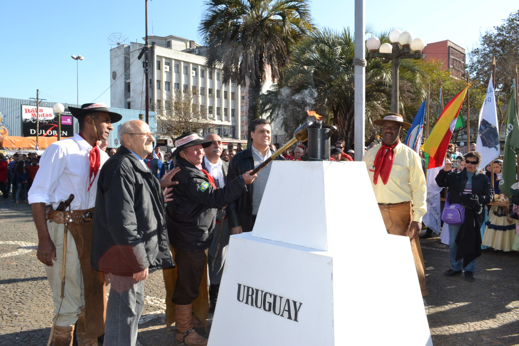 O vice-prefeito Municipal Leonel Gornatti, acompanhado dos secretários de Turismo, Nei Oliveira, do Desenvolvimento, Sérgio Aragon, da Agricultura, Gregório Herede, de Administração, Éder Fialho, de Trânsito e Mobilidade Urbana, Roni Dário, de Cultura e Lazer, Maurício del Fabro, do Intendente de Riveira, Marne Osorio, do presidente da Câmara de Vereadores, Sérgio Moreira e do Bispo da Diocese de Bagé, Dom Gílio Felício, receberam, na manhã dessa quarta feira, 14/07,em frente ao Galpão Binacional que está localizado no Parque Internacional, a centelha da Chama Crioula trazida pelo grupo de cavalgada santanense. Após percorrem 680 quilômetros, de Taquara a Santana do Livramento, a centelha trazida pela 26ª Cavalgada Santanense marcou o início da Semana Farroupilha. Na ocasião foram distribuídas centelhas para as 39 entidades representativas da cultura gaúcha que participam das comemorações. O Vice prefeito destacou a importância da comemoração se dar dos dois lados da fronteira. “A única diferença entre os nossos povos é a língua, de resto a comunidade fronteiriça comunga dos mesmo valores, e o esforço e sacrifício dos cavalarianos representa bem as virtudes do nosso povo” afirmou Gornatti. Após a cerimônia, todos os ginetes que participaram da cavalgada receberam medalhas pelo feito.